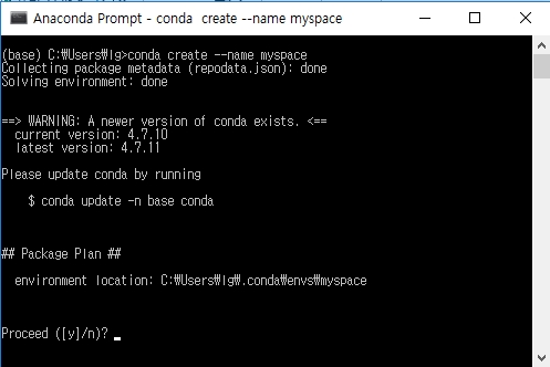 - 마지막 줄에 (myspace) C:\User\lg 라고 적힌 것처럼, 가상환경에 진입하게 되면 앞에 (가상환경이름) C:\User\lg 이렇게 표시됩니다.